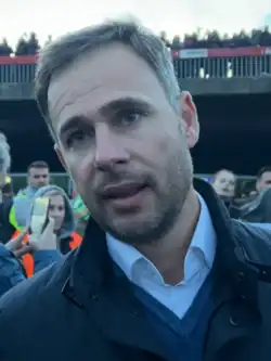 Aleksić became a prominent URS spokesperson at the republic level early in his mayoralty.[10] He was given the eleventh position on the party's list in the 2014 Serbian parliamentary election but was not elected when the list failed to cross the electoral threshold for assembly representation.[11] The URS became dormant after the election, and Aleksić left the party later in the year to become acting president of a breakaway group called the People's Party of Serbia (NSS).[12][13][14] The group formally constituted itself as the People's Movement of Serbia in January 2015, and Aleksić was chosen as its leader in February.[15][16][17]