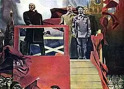 "1918" was exhibited at the largest exhibitions in Moscow,[15] given a special commendation by the Ministry of Defence,[14] reproduced in the journals "Tvorchestvo" (1965 and 1967), "Ogoniok" (1967), and "Art" (1967, 1969), in the books "Art born of October" (1967) and "The glory of those days will never cease" (1968),[15] represented Soviet art at the international Biennale exhibition in Venice in 1966 and at an exhibition of young artists in Berlin (GDR)[16] in 1967. The painting became an acknowledged part of official Leniniana[15] and brought fame throughout the Soviet Union for Gennady Mosin and Misha Brusilovsky.[17] The cinematographer Boris Shapiro made a film about the creators of the painting[18] for the cinema journal "Soviet Ural".