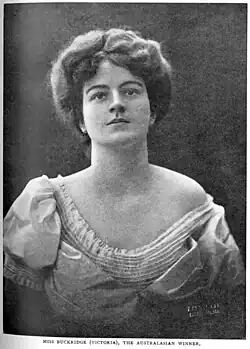 The first Miss Australia contest was held in 1908 as a one-off event sponsored through the Lone Hand, with entrants from New South Wales, Victoria and Queensland. The winner was Alice Buckridge from Victoria.[3] The primary purpose of the contest was "to attract customers: whether they were newspaper readers, patrons at an amusement venue or visitors to a country fair" (Saunders and Ustinoff, 2005:4)