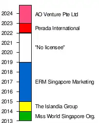After the Islandia Group stopped all marketing campaigns for the aforementioned project on 1 December 2014,[15] the license was purchased by the pageant organizer led by Alex Liu, Exclusive Resource Marketing Pte., Ltd. (ERM Singapore Marketing Group), which served as the national licensee for Miss Grand International Singapore from 2015 to 2018.[1][16] The country representatives during that time were either appointed or determined through the Miss Singapore Beauty Pageant.[16]