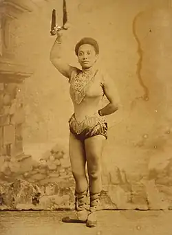 Miss La La (April 21, 1858 - March 21, 1945) was an Afro-German[1] aerialist who served as muse to Edgar Degas and was depicted in his 1879 painting Miss La La at the Cirque Fernando.[2][3] She was also depicted in a poster for the Folies Bergère.[4] She was the star of Troupe Kaira, a traveling circus act, and performed with the Cirque Fernando, based in Montmartre.[2]