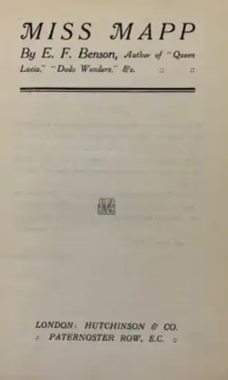 Miss Mapp is a 1922 comic novel written by E. F. Benson. It is the second of six novels in the popular Mapp and Lucia series, about idle women in the 1920s and their struggle for social dominance over their small communities. This book introduces Miss Mapp, the social tyrant of the fictional coastal town of Tilling, and the cast of Tillingites, including Diva Plaistow, Major Benji Flint, Mr. and Mrs. Wyse, and Quaint Irene. Tilling was inspired by the town of Rye, where Benson lived at Lamb House, with his own commanding view of the High Street inspiring Mapp's domain, Mallards.[1]