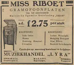 Though initially limited to an amusement park in Central Java,[6] the troupe quickly proved popular and travelled from city to city. They sold gramophone records to supplement their income,[7] and Miss Riboet became the first recording star of the Indies.[8] Stores sold Miss Riboet brand merchandise, including wristwatches.[2] In 1927 the company attempted to make a film. Tio asked Nelson Wong to first record the troupe's performances, a task which Wong did using a simple camera. Hoping to create a profitable fiction film, Tio asked Wong to direct, a request Wong accept as long as Tio would help bring Wong's brothers from China. When the brothers arrived in the Indies, Tio bought an old tapioca flour factory in Bandung for them to use as a studio.[9] Nelson and Tio began plans to make a film starring Miss Riboet, but these were cancelled after discovering that Riboet's face was "not photogenic".[a][10]