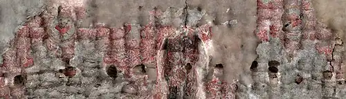 During work on the church's exterior walls in 1918, a policeman, Charles Fennell, discovered a frieze in the old sacristy: "Fennell, watching workmen engaged in buttressing the walls of the building, had his attention attracted by streaks of color flashing from pealing kalsomine on what was once the interior of the old sacristy ... one of the details looked like a horse shoe, and what resembled a hand or a running or gesticulating figure of man could also be discerned."[10] According to the same article, "The old sacristy walls were preserved with a sheathing of wood by Father Prendergast away back in 1862."[10] By 1918 the mural had already been covered for over 120 years.