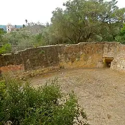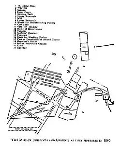 In 1806, a square stone reservoir was constructed as part of an irrigation system providing water for the Mission's orchards and gardens.[14] Originally measuring 7 ft (2.13 m) deep with an area of 110 ft2, the reservoir was capable of holding some 535,000 gallons of water.[12] Located north of Almeda Padre Serra within Mission Park, this reservoir was well-crafted enough to be utilized by the city for water storage until 1993. It was hence transferred from the Public Works Department to the Parks Department to serve as part of Mission Historical Park.[15]