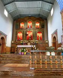![]() A view of the Mission San Juan Bautista and its three-bell campanario ("bell wall"). Two of the bells were salvaged by Father Nick Senf in 2009 from the original chime, which was destroyed in the 1906 San Francisco earthquake. | |