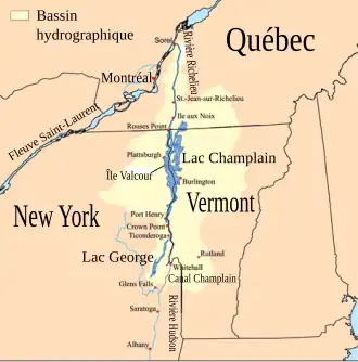 Missisquoi Bay is a large extension in the northern part of Lake Champlain, at the East of the output of the latter in Richelieu River.[1] It takes the form of a violin head, with the neck extending from the head of the lake and is about 5 kilometres (3.1 mi) in diameter. The bay is divided between Quebec in Canada and Vermont in the United States. The main town on its banks is Venise-en-Québec, a major summer resort. The river of the same name flows into the bay and the Missisquoi National Wildlife Refuge is located on the American side.