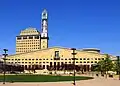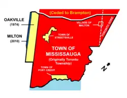 While the Township had many settlements within it, none of them (save for the larger enclave communities of Port Credit and Streetsville) were incorporated, and all residents were represented by a singular Township council (Malton had special status as a police village, allowing it partial autonomy). To reflect the community's shift away from rural to urban, council desired conversion into a town, and in 1965 a call for public input on naming it received thousands of letters offering hundreds of different suggestions.[28] "Mississauga" was chosen by plebiscite over "Sheridan" by a vote of 11,796 to 4,331,[29] and in 1968 the reincorporation went forward, absorbing Malton in the process. Port Credit and Streetsville remained separate, uninterested in ceding their autonomy or being taxed to the needs of a growing municipality. Political will, as well as a belief that a larger city would be a hegemony in Peel County, kept them as independent enclaves within the Town of Mississauga, but both were amalgamated into Mississauga when it reincorporated as a city in 1974. At this time, Mississauga annexed lands west of Winston Churchill Boulevard from Oakville in the northwest,[b][30] in exchange for lands in the northernmost extremity (which included Churchville) south of Steeles Avenue which were transferred to Brampton.[31] That year, Square One Shopping Centre opened; it has since expanded several times.[32]
