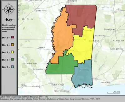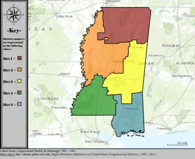 Table of United States congressional district boundary maps in the State of Mississippi, presented chronologically.[3] All redistricting events that took place in Mississippi between 1973 and 2013 are shown.