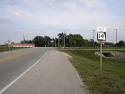 Route 14 is a state highway traveling through the southern part of the U.S. state of Missouri. Its western terminus is at U.S. Route 60 (US 60) in Marionville, and its eastern terminus is at US 63 on the northern edge of West Plains. Route 14 is a two-lane highway for its entire length, however, there are plans to widen Route 14 in some spots.[1]