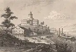 The fourth state capitol (and the first in Jefferson City) was made out of brick, two stories tall, measured approximately 40 by 60 feet (12 m × 18 m), and took two years to complete. It was built for approximately $18,500 (equivalent to $514,137 in 2024). It was called the "Governor's House and State Capitol." This building burned a decade later in 1837. The site is now occupied by the present-day Missouri Governor's Mansion. It was designed by Stephen Hills (1771-1844), and modeled on his similar designs for the earlier first Pennsylvania State Capitol (1821-1897), built of red brick Federal style of architecture in Harrisburg, Pennsylvania on the east bank of the Susquehanna River.[5] Architect Hills also designed other structures in the state such as the Academic Hall of the University of Missouri at Columbia; the remnant ruins of "The Columns" of six Greek Ionic style columns that still stand that survived the 1892 fire that destroyed the historic building are now the campus's landmark columns at the David R. Francis Quadrangle on the University's grounds.