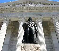 The exterior of the Missouri State Capitol is notable for its architectural features: the Baroque dome, loosely modeled after St. Peter’s basilica in Rome, rising 238 feet (73 m) above ground level, topped by sculptor Sherry Fry’s bronze statue of Ceres, the Roman goddess of agriculture; the eight 48-foot (15 m) columns on the south portico; the six 40-foot (12 m) columns on the north portico; the 30-foot (9 m)-wide grand staircase; and the bronze entrance doors, each 13 by 18 feet (4.0 m × 5.5 m)—at the time, the largest cast since the Roman era.[4]