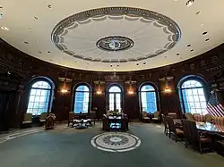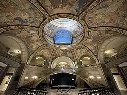 In November 2006, the 9,000 lb (4,100 kg) dome chandelier, which had been lowered almost to the floor for maintenance, fell the remaining five feet.[7] The chandelier was damaged by the impact and by the ornamental chains that fell on it. It was sent to a St. Louis company for repairs. Nearly a full year later, the chandelier was returned to Jefferson City and raised in the capitol. The upper lights were also restored, after they had been turned off for four decades due to light damage to the mural above. Created in 1918 by the Guth Lighting Company of St. Louis for a cost of $5,000 (equivalent to $104,524 in 2024), the chandelier cost $500,000 (equivalent to $779,878 in 2024) to be restored.[8]