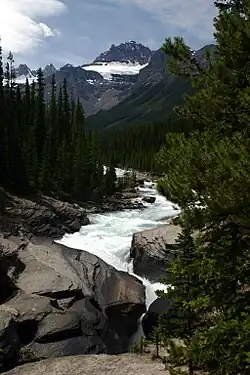 Mistaya Canyon is a canyon in the western part of the Canadian province of Alberta.[1] It is formed by the Mistaya River. Tourists who are visiting Banff National Park often visit it because of its distinctive curvy canyon walls and because it is easy to access, being just off the Icefields Parkway. The 0.5 km trail to the canyon is located at a large parking area on the west side of the Parkway, part way up the long hill south of the North Saskatchewan River. There are actually two such parking areas on the hill; the Mistaya one is clearly marked by signs on the highway and at the beginning of the trail. The trail is an easy walk in summer but too steep for wheelchairs. The canyon is deep and there are no railings. The trail is icy in early spring.