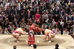 Mitakeumi began the Hatsu tournament in January 2017 with a win over ōzeki Gōeidō, and on Day 2 he earned his first kinboshi (a yokozuna upset by a wrestler from the maegashira ranks) when he defeated Harumafuji.[21] He also defeated yokozuna Kakuryū on Day 4.[22] He finished with 11 wins and was awarded a Technique prize for his performance in this tournament.[23] He returned to the sanyaku ranks in the March 2017 tournament at komusubi, and came through with a winning record of 9–6. In May he defeated Kakuryū on Day 1 and Harumafuji on Day 11 (which was Harumafuji's first loss in the tournament). He finished with an 8–7 record and received the Outstanding Performance Award for the first time. He was promoted to sekiwake for the July 2017 tournament, the first wrestler from Dewanoumi stable to achieve this since Dewanohana in 1982.[24] In this tournament he defeated yokozuna Kisenosato on opening day, and tournament leader Hakuhō on Day 11, who was on a 25-match winning streak and hoping to equal the all-time career wins record of 1047.[25] Mitakeumi's only previous win over Hakuhō had been by default when the yokozuna pulled out of the March 2017 tournament through injury.[25] He ended the tournament with a 9–6 record and received a second consecutive Outstanding Performance award. In an interview immediately after the tournament he commented "I didn't think I would be able to win this award twice in a row so I am pleased. It was good that I was able to wrestle my brand of sumo at this tournament, win on the last day and also get a victory against Hakuho".[26] Mitakeumi maintained his sekiwake rank in the September and November tournaments, and was the only top division wrestler to secure a majority of wins against losses in every tournament of 2017. In January 2018 he started well with seven straight wins but he recorded only one more win (over Kakuryū) in the tournament. A 7–8 result in March saw him demoted to komusubi but he rebounded with 9 wins in May to return to sekiwake.