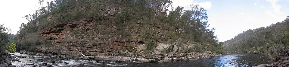 Formed by the confluence of the Wentworth and Wonnangatta rivers and Swamp Creek near Horseshoe Bend, north of the national park that bears its name, the Mitchell River rises in Lake Tabberabbera, drained by runoff from the southern Victorian Alps of the Great Dividing Range. The river flows generally south in a highly meandering course in its upper reaches through the Mitchell River National Park, and then south by east as it spills onto the fertile Gippsland Plain west of Lindenow. The river then flows generally east towards Bairnsdale and empties into Jones Bay, part of Lake King, within the Gippsland Lakes via the silt jetties, a narrow 8 kilometres (5.0 mi) long digitate delta.[8] Within the lake, the Mitchell is joined by the Nicholson and Tambo rivers; and then enters Lake Victoria, where the Mitchell and Latrobe rivers form their confluence, with the Mitchell reaching its mouth in Bass Strait, south of Lakes Entrance. The river descends 137 metres (449 ft) over its 121-kilometre (75 mi) course; joined by more than thirteen tributaries,[7] many of which are surrounded by dense native forest.