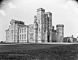 In 1823, after his succession, their son, George, 3rd Earl of Kingston, demolished the Palladian house and replaced it with a new castle designed by James and George Richard Pain.[1] It had 60 principal and 20 minor bedrooms, a 100-foot-long (30 m) gallery, three libraries, morning room, dining room (which could seat 100 guests at one sitting) and various other facilities.[2]