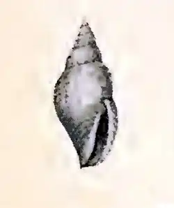 (Original description) The uniform light brown shell is small, narrow, somewhat solid and has a fusiform shape. It is composed of 5½ slightly convex whorls, with a well impressed suture. The embryonic portion consists of 1½ whorl smooth and slightly swollen from the dorsal aspect, and apparently with an exsert tip. The penultimate and spire whorls relatively strongly ornate, with close narrow ribs traversed by a few strong spiral threads. On the penultimate whorl itself there are twelve or thirteen ribs which are broader than the interspaces, and there are about five spiral threads, the median one being the coarsest. The ribs gradually fade out on the body whorl, but there are numerous (about fifteen) more or less irregular spiral threads, the strongest being situated at about the shoulder. The aperture is elongate-ovate, a little less than half the length of the shell, with a very broad anterior canal. The columella is smooth, slightly excavated medially, and with a gentle twist towards the anterior end.[2]