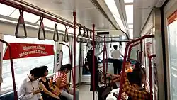 The interior of the Sengkang and Punggol LRT trains feature an indigo seats and red grab poles. 16 of the C810s that underwent modification have two seats in the front and back converted into perch seats, thus reducing the number of seats to 14 from the usual 18 seats.