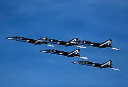 The XT-2 was redesignated T-2 on 29 August 1973,[5] entering service in 1975, with the first unit, the 21st Hikōtai becoming fully operational on 1 October 1976, with a second squadron, the 22nd Hikōtai following on 5 April 1978, allowing the North American F-86 Sabre to be phased out of the advanced training role. The "Blue Impulse" aerobatic display team of the JASDF re-equipped with the T-2 in the winter of 1981–82. T-2s were also used by a dedicated Aggressor squadron, being replaced by the McDonnell Douglas F-15 Eagle. T-2s were also used as conversion trainers for squadrons operating the Mitsubishi F-1, a development of the T-2.[14]