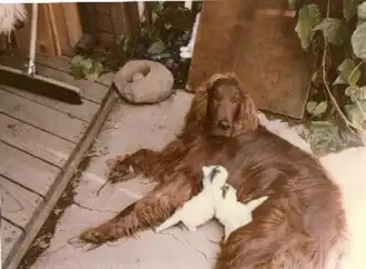Seamus (/ˈʃeɪməs/ SHAY-məs), an Irish Setter, was an active, outgoing dog, and was the Romney family's first pet dog.[5] It is generally reported that, a few years after his ride to Canada, Seamus was given to Mitt Romney's sister, Jane Romney Robinson of California, who said, "He kept ending up at the pound. They were worried about him getting hit crossing the street. We had more space, so he could roam more freely."[6] The dog's date of death is unknown, but Robinson stated that Seamus lived to a "ripe old age" on her farm in California.[7]