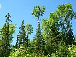 The white spruce–aspen mixedwood associations of the Prairie Provinces have a variety of compositions ranging from pure aspen to pure white spruce, to mixtures of both. Balsam poplar, white birch, black spruce, balsam fir, and pines may also occur.[3] Silvicultural treatments have generally been aimed at promoting white spruce, primarily through plantation establishment and management. The type of stand of a given association is as much a product of successional stage and stand history [4] as it is of site type.[5] Depending on seed source and seedbed conditions, recruitment of white spruce may begin relatively soon after disturbance or may be spread over many decades.[6]