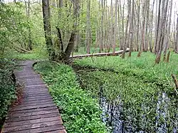The next points of interest along the trail include the old watermill, which today also houses a restaurant, and the ruin of a long barrow. The route then leads into the ancient woodland, the forest swamp, which is crossed on a footbridge. Among the Red Alders are tussocks rich in herbs. The trail continues through The Prehistoric Forest, which the museum planted in 1964 to illustrate the ecological succession in the forests of Denmark from the Stone Age until today. Thus the forest is divided into the periods Birch and Pine period (9550–8250 BC), Hazel and Pine (8250–7500 BC), Early Lime (7000–3800 BC), Late Lime (3800–700 BC) and Beech (700 BC – today).[17] The trail exits the Beech period close to the beach.
