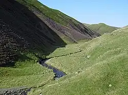The Moffat Water is a small river in northeastern Dumfriesshire, Scotland. Its headwaters rise at Birkhill in the midst of the Moffat Hills, close to the border with Selkirkshire (which corresponds to the watershed between the Annan and Ettrick basins). From here, it flows southwestwards through the narrow valley of Moffatdale, eventually joining the Annan and the Evan at Threewater Foot, south of Moffat town. Its tributaries include the Tail Burn, the outlet of Loch Skeen, which enters Moffatdale by way of a picturesque waterfall known as the Grey Mare's Tail.[1]