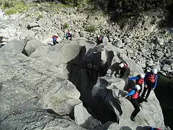 Moving closer to the grade V section, the boulders become larger and the banks narrow into a deep gorge. Large conglomerate blocks form the first rapid then the river eases into a sedimentary rock canyon. The boulders, while impressive in size, are even more intriguing because of the holes and depressions the water has carved into them. House rock worth a closer look; the center has been carved out and is accessible only by a hole in the side.[10] Fossilized shells and organic matter have been remarkably well preserved in the stones.