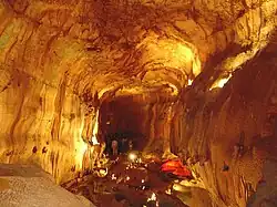 The Moinhos Velhos Cave (Portuguese: Gruta de Moinhos Velhos), is one of the most important cave systems known in the Portuguese Estremadura Limestone Massif, with about 9 km in extension. It is characterized by the existence of two fóssil paragenetic main conduits of about one decametre in diameter with dendritic tributaries, and a set of semi-active passages in a dendritic pattern at the north and angulate at the south. The fossil zone has a drop of 100 metres and the thickness of intermediate zone varies from 80 metres upstream to 60 metres downstream. Water flows in syngenetic galleries, from the northern to the southern quadrant, towards Gruta da Pena spring. It's possible to distinguish four genetic phases in the cave system development. The first one is represented by superficial phreatic galleries of small diameter, the second one by the Galeria Gémea paragenetic main conduit, the third one by the Galeria Grande and his tributaries and the last one by the active and semi-active galleries of the lower cave levels. This cave is inhabited by several endemic trogobionts: the ground-beetle Trechus lunai, the cave spider Nesticus lusitanicus and by several stygobionts, being the isopod Proaellus lusitanicus the most abundant.