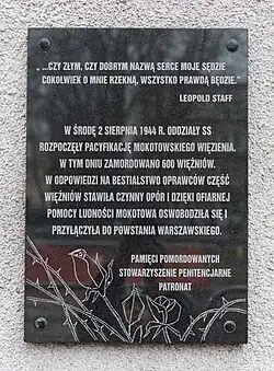 The Massacre in the Mokotów prison was a mass murder of residents of the Mokotów Prison in Warsaw by the Germans on the second day of the Warsaw Uprising. On August 2, 1944, soldiers of the Waffen-SS - SS-Pz. Gren. Ausb.-und Ers. Btl. 3 (of SS-Panzer Division "Totenkopf") shot about 600 Poles on the premises of the prison at 37 Rakowiecka Street. It was one of the biggest crimes committed by the Germans in Mokotów during the suppression of the Warsaw Uprising. During the massacre, some prisoners actively resisted the Nazis, which allowed several hundred people to escape to the area controlled by the insurgents.