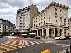During the Warsaw Uprising of 1944, the street's vicinity was defended from the Germans by the Home Army's Ruczaj Battalion.[12] Although Mokotowska was not spared from considerable damage and partial destruction in the war, much of its historic character remained and it hosts some of the finest examples of pre-war architecture in Warsaw, along with the intersecting Wilcza Street and other areas of South Downtown.[13] Threatened by new urban planning under the Polish People's Republic, it was listed in the Registry of Cultural Property as a heritage place in 1965 to protect it from further alterations.[2] Nonetheless, many structures were simplified and stripped of their rich façade moldings, cartouches and ornaments after the war.[8] Several new buildings built in the socialist realist style were also inspired by older tenements.[8]