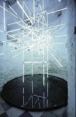 Since 1996, together they have formed the artist duo Molitor & Kuzmin. In their installations and Light art objects they work with the play of light and shadow, with contrasts and paradoxes. Preferred materials include fluorescent lamps that they deploy like modules, as design elements of their artworks. At a remove from their original meaning, these modules are combined into artefacts, whose technical character and materiality appear to dissolve in radiant brightness, resulting in a work which presents light: Die Leuchtstoffröhre ist Form und Farbe zugleich. (in English: The fluorescent tube is form and colour as well.) [3]