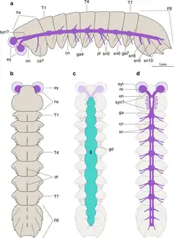 - ^ a b Ortega-Hernández, Javier; Lerosey-Aubril, Rudy; Losso, Sarah R.; Weaver, James C. (2022-01-20). "Neuroanatomy in a middle Cambrian mollisoniid and the ancestral nervous system organization of chelicerates". Nature Communications. 13 (1): 410. Bibcode:2022NatCo..13..410O. doi:10.1038/s41467-022-28054-9. ISSN 2041-1723. PMC 8776822. PMID 35058474.