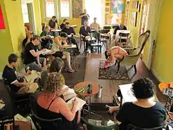 In 2005, she and illustrator A. V. Phibes founded Dr. Sketchy's Anti-Art School, a burlesque life-drawing class.[21][22] At a typical session, artists may drink alcohol while sketching burlesque models and play art games in a venues ranging from bars to art museums. After an artist inquired about starting a Dr. Sketchy's in Melbourne, Australia, it began to spread around the world.[23] As of 2010, there were approximately 150 licensees using the Dr. Sketchy's name.[24]