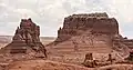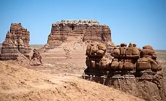 Mollys Castle is a geological feature set within the San Rafael Desert on the southeastern edge of the San Rafael Swell. This erosional remnant is composed of Jurassic rock. The thin, light-colored layer on top is Curtis Formation caprock, overlaying darker, reddish Entrada Sandstone, which is also the composition of the hoodoos that give Goblin Valley its name.[4][5]