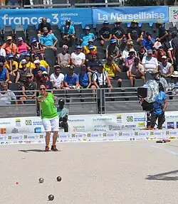 Le Mondial la Marseillaise à Pétanque is an international tournament of the sport of pétanque. It is held every year in July in Marseille, the biggest city in the south of France. The central location of the event is in the Parc Borély, but it now extends to many other parks and boulodromes in and around the city. In 2016, the 55th Mondial attracted around 15,000 participants and 150,000 spectators. The competition presents 3 tables: male, female and junior in mixed.[1] Certainly, it is the biggest event in the world for pétanque, though with 15,000 players it is also most likely the biggest single sport event in the world.
