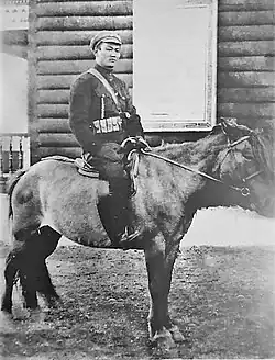 News of von Ungern-Sternberg's seizure of Urga again influenced Soviet plans. A plenary session of the Comintern in Irkutsk on February 10 passed a formal resolution to aid the "struggle of the Mongolian people for liberation and independence with money, guns and military instructors".[30] With Soviet support, the MPP was now a serious contender for power. The Party, hitherto rather amorphous and loosely connected, required better organisational and ideological definition. A party conference (subsequently regarded as the first congress of the Mongolian People's Revolutionary Party) met secretly on 1–3 March at Kyakhta. The first session was attended by 17 persons, the second by 26. The Party approved the creation of an army command staff headed by Sükhbaatar with two Russian advisors, elected a central committee chaired by Danzan with one representative from the Comintern, and adopted a party manifesto composed by the progressive Buryat Jamsrangiin Tseveen.[31] On 13 March, a provisional government of seven men was formed, soon to be headed by Bodoo. On 18 March, the Mongolian guerrilla army, its ranks now enlarged to 400 through recruitment and conscription, seized the Chinese garrison at Kyakhta Maimaicheng (the Chinese portion of Kyakhta). A new confidence now animated the Party. It issued a proclamation announcing the formation of the government, the expulsion of the Chinese, and the promise to convene a congress of "representatives of the masses" to elect a permanent government.[32] A propaganda war of sorts between the provisional government and the Bogd Khaan's court followed: the Party saturated the northern border with leaflets urging people to take up arms against the White Guards; the legal government of the Bogd Khaan government barraged the same area with warnings that these revolutionaries were intent upon destroying the Mongolian state and shattering the very foundations of the Buddhist faith.[33]