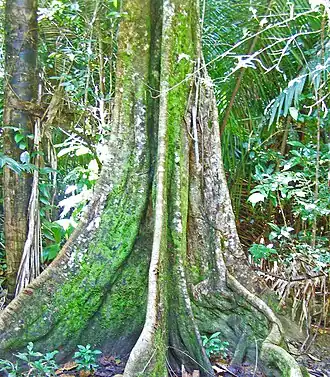 Along the middle and lower reaches, the forest is secondary, betraying the heritage of banana farms and slash-and-burn practises used historically in this area. Today much of this area is protected as the Payne's Creek National Park. Here, relatively dense jungle canopy has returned, resulting in a closed canopy of approximately 15 to 20 metres in height. Yellow bay cedar and other significant sized broadleaf species abound, along with numerous tropical vines and thorny undergrowth flora. A machete is essential for exploration even where there is an established trail. Black howler monkey troops are plentiful, each troop maintaining a home range of 40,000 to 70,000 square metres in this forest.[3]
