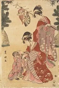 The monkey is a malicious trickster in Saru Kani Gassen ("Battle of the Crab and the Monkey") over a rice-ball and a persimmon seed.[19]