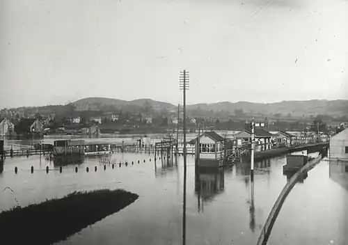 ![]() May Hill Station during floods, probably in 1910. The River Wye runs across middle of the picture and quayside buildings are located to the middle and left. | |||||