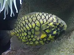 The pineconefish is yellow with distinct large scutes outlined in black.[1] It has light-producing organs filled with luminescent bacteria on each side of the lower jaw, the purpose of which is not known, but may help it to see at night or to attract prey. The fish grows to 17 cm, but is more commonly found up to 12 cm.[2]