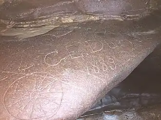 In 1880, Ziebold began a modernization project. He contracted with the Richmond Indiana Steel Company to install metal rollers to replace the water-powered grindstones. In 1882, Richmond Steel sent Charles Duryea to install the new equipment.[3] Duryea spent at least 2 years in Monroe City, living with the Ziebold family. He visited the Madonnaville Cave where he etched his name and bicycle drawings into a rock shelf.