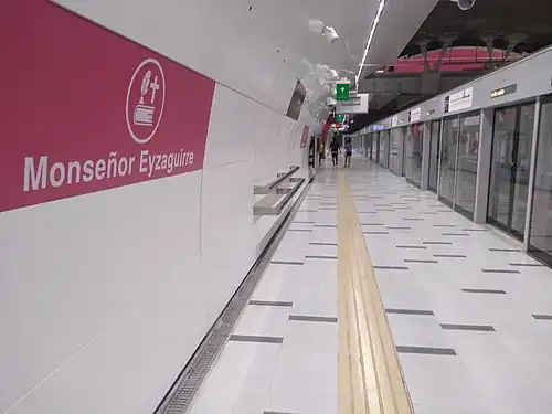 Monseñor Eyzaguirre is an underground metro station of Line 3 of the Santiago Metro network, in Santiago, Chile. It is an underground, between the Irarrázaval and Ñuñoa stations on Line 3. It is located at the intersection of Irarrázaval Avenue with Monseñor Eyzaguirre Street. The station was opened on 22 January 2019 as part of the inaugural section of the line, from Los Libertadores to Fernando Castillo Velasco.[3]