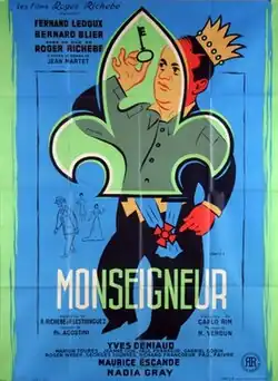 Monseigneur is a 1949 French drama film directed by Roger Richebé and starring Fernand Ledoux, Bernard Blier and Nadia Gray.[1] [2] It was shot at the Neuilly Studios in Paris and on location around the city. The film's sets were designed by the art director Jacques Krauss.