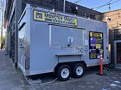 The restaurant Monster Smash serves smash burgers and other food options from a food cart in Portland, Oregon. It neighbors the bar Belmont Station on Stark Street in southeast Portland's Sunnyside neighborhood. The OG Smash Burger has two beef patties, American cheese, housemade pickles, and "Monster sauce" on a brioche bun made by Dos Hermanos Bakery. A vegan burger uses Beyond Meat "beef".[1] Willamette Week has described the "Monster sauce" as a "classic" Thousand Island-style dressing with ketchup, mayonnaise, yellow mustard, and seasonings.[2] One salad has beets, fennel, goat cheese, candied pecans, and pomegranate seeds.[1] French fries are served with garlic aioli.[3] The Soup & Sando option has a smoked tomato bisque and a sandwich with pesto, provolone, and genoa salami.[1]