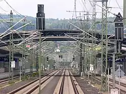Five tracks are available for passenger transport. Next to track 1 and between tracks 4 and 5, there are two 405 m long and 76 cm high platforms,[7] which both have a 200-metre-long section under cover.[5] The platform face on track 5 is divided into platform 5a to the west and 5b to the east, with mid-platform exit tracks that cross, permitting trains to run in both directions.[1] Track 5 is used exclusively by regional trains and tracks 1–4 are only used by ICEs. Tracks 2 and 3 are the main tracks used by non-stopping trains on the high-speed line. In addition, there are seven tracks available for freight.