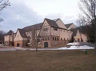 Montauk Tennis Auditorium, also known as Montauk Playhouse, is a historic tennis center located at Montauk in Suffolk County, New York, just below Montauk Manor. It was built in 1928-1929 as one of the central buildings of the great resort which developer Carl G. Fisher planned and partially completed in the 1920s. The Tudor Revival style structure is of light steel frame construction sheathed in prefabricated plywood frame panels and coated in stucco. The base is formed of rough fieldstone. The building is composed of three main volumes: two main gable roofed volumes mark the main tennis halls while the lower, shed roofed volume contains the lobbies and lounges. It began being used for stage productions in the 1950s.[2] It now operates as a community playhouse.