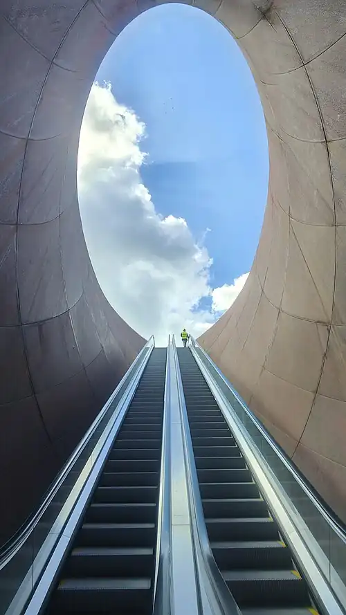 The station's design is highly ambitious: the planned exits will be made of steel and will have a sinuous, mouth-like shape, resembling fissures in the ground. Many have mischievously associated the structures with female genitalia, a comparison partially acknowledged by Amanda Levete, a collaborator on Kapoor's project.[2]