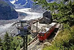 The Montenvers Railway or Chemin de fer du Montenvers (French pronunciation: [ʃəmɛ̃ fɛʁ dy mɔ̃tɑ̃vɛʁ]) is a rack railway line in the Haute-Savoie department of France. The line runs from a connection with the SNCF, in Chamonix, to the Hotel de Montenvers station, at the Mer de Glace, at an altitude of 1,913 m (6,276 ft).